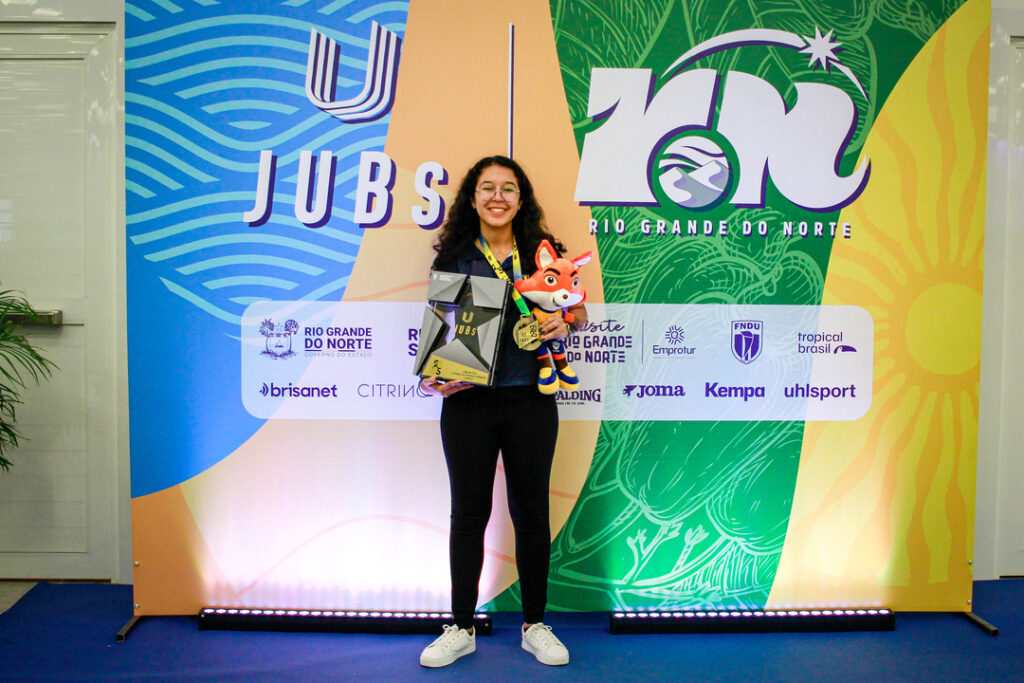 “Foi uma experiência incrível, estrutura e organização sensacionais. Conheci pessoas incríveis e as meninas da minha modalidade eram super queridas. Terminar a competição em primeiro significou muito, não apenas por ser minha primeira competição, mas por deixar o nome da UFC e do Ceará no topo”, relata a estudante, que volta para casa com medalha, troféu e o mascote dos JUBs 2025.