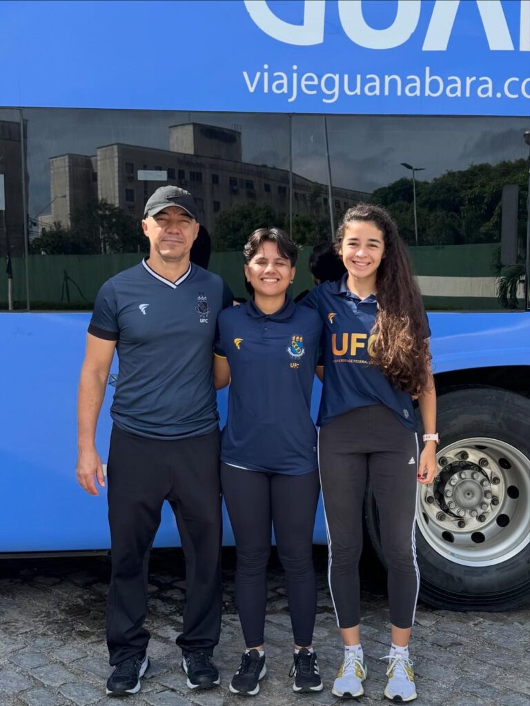 (da esquerda para a direita: Wildner Souza, Coordenador de Desporto Estudantil e secretário-adjunto de Esportes da UFC; Heloisa Rocha (licenciatura em Educação Física); Vitória Ribeiro (Engenharia de Alimentos) UFC participa dos JUBs Fut 2026 no desafio X1. Foto: Arquivo pessoal.