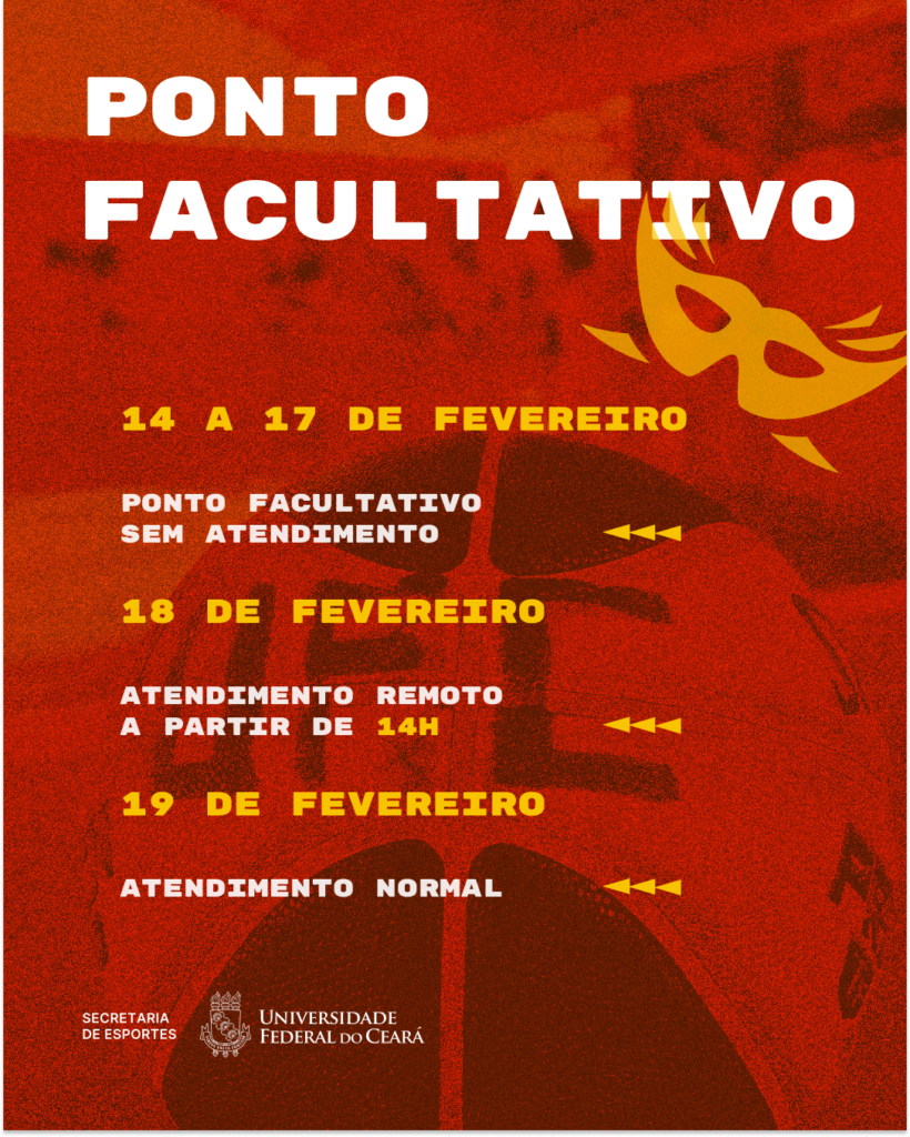 Data da publicação: 13 de fevereiro de 2026 Categoria: 2026, NotíciasA Secretaria de Esportes da Universidade Federal do Ceará (Sesp-UFC) informa que não haverá atendimentos ao longo do período de ponto facultativo do Carnaval 2026, compreendido entre os dias 14 a 17 de fevereiro. Estão momentaneamente suspensas as atividades administrativas e esportivas conduzidas na Quadra do Centro Esportivo Universitário (CEU) e na sala administrativa da unidade durante o período.